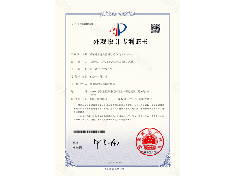 中國外觀設(shè)計專利:紙尿褲滲透性能測定儀(ZL 2022 3 0777832.X)
