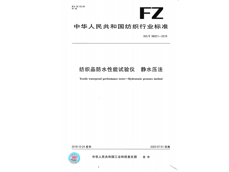 參與起草《紡織品防水性能試驗儀 靜水壓法》(FZ/T 98021-2019),該標(biāo)準(zhǔn)由中華人民共和國工業(yè)和信息化部于 2019-12-24 發(fā)布