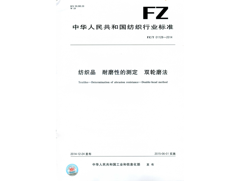 參與起草《紡織品 耐磨性的測定 雙輪磨法》(FZ/T 01128-2014),該標(biāo)準(zhǔn)由中華人民共和國工業(yè)和信息化部于 2014-12-24 發(fā)布