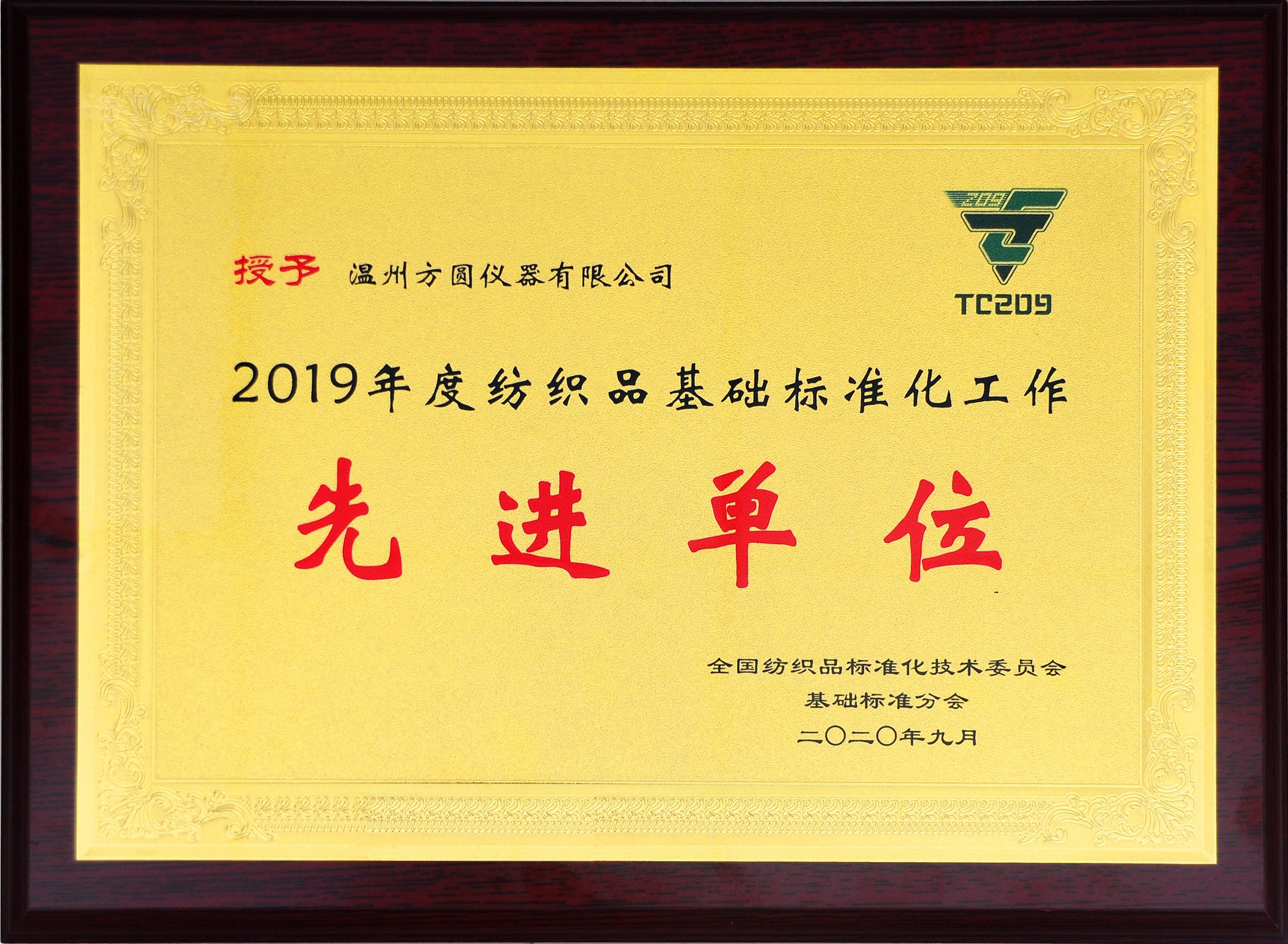 2019年度紡織品基礎(chǔ)化標(biāo)準(zhǔn)工作先進(jìn)單位獲得者“溫州方圓儀器有限公司”