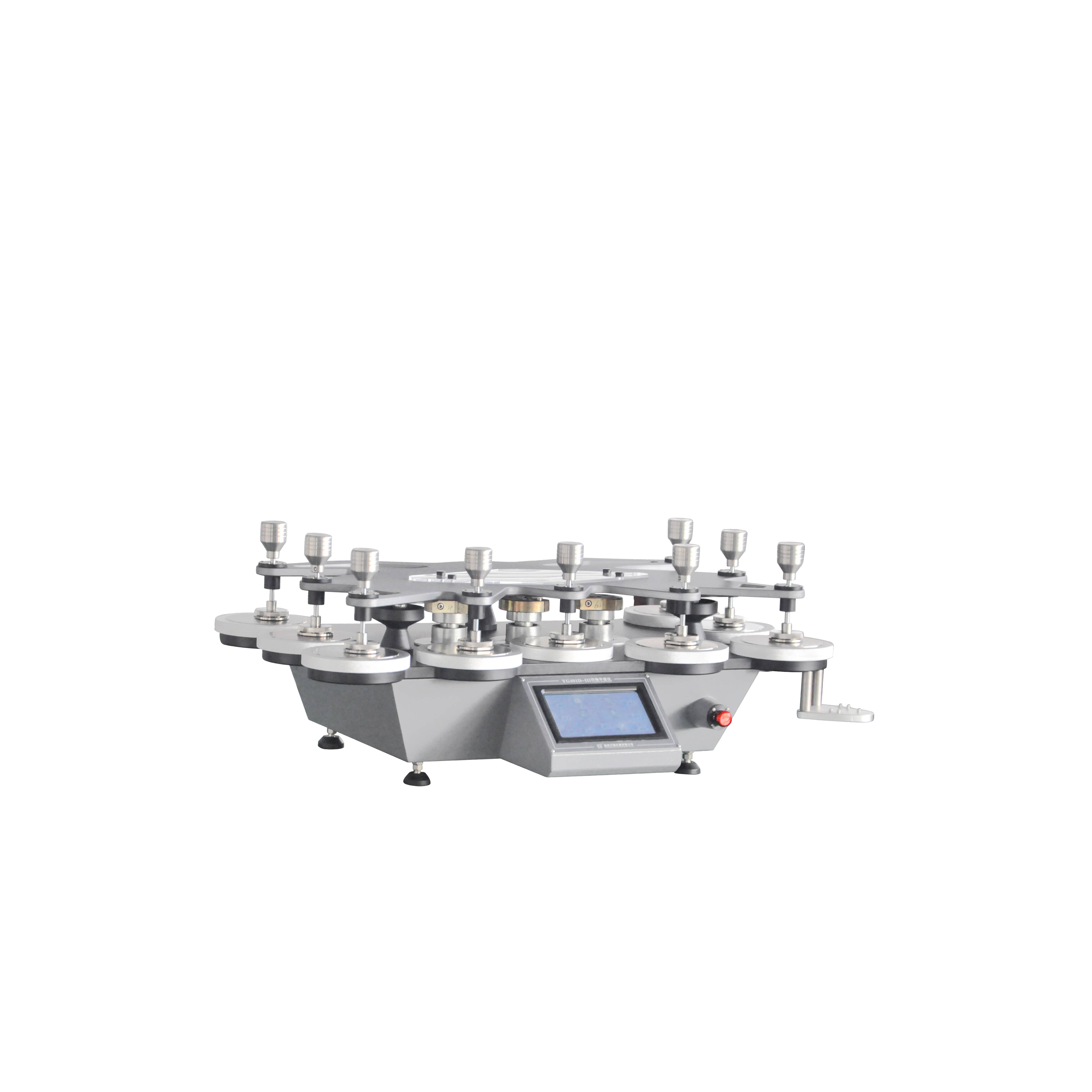 72 YG401F織物平磨儀(九工位) GB/T4802.2-2008,GB/T13775,GB/T21196.1,GB/T21196.2,GB/T21196.3,GB/T21196.4;FZ/T20020;ISO12945.2、12947;ASTM D 4966、4970、IWS TM112,可以增加球盤法測試功能(選配)等標準。